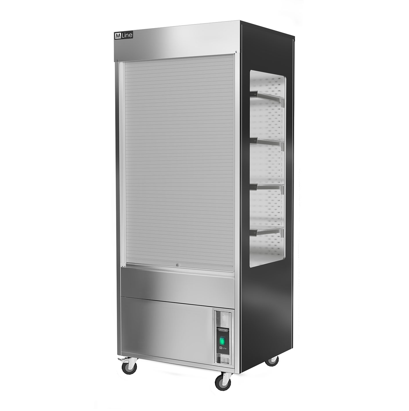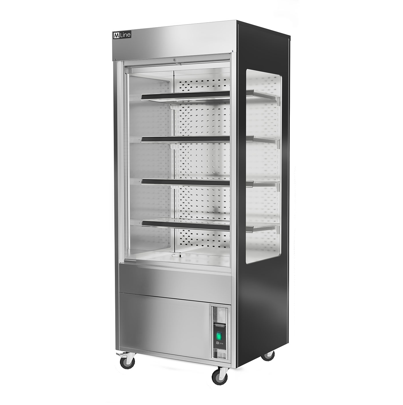 Designed to compliment the chilled M-Line merchandisers with panoramic side glass, internal glass shelving and LED illumination for enhanced food display and all round viability. These sharp styled units are a perfect fit for any modern designed retail grab and go food outlet, ideal for delicatessens, restaurants, universities, schools, hospitals, supermarkets and coffee shops. The hygienic free-standing mobile design made inside and out from bright polished stainless steel provides easy access for pre packed snacks and cool drinks. Incorporating a low height base display and 4 glass display shelves. Perfect for confectionery, crisp snacks, and fruit etc.