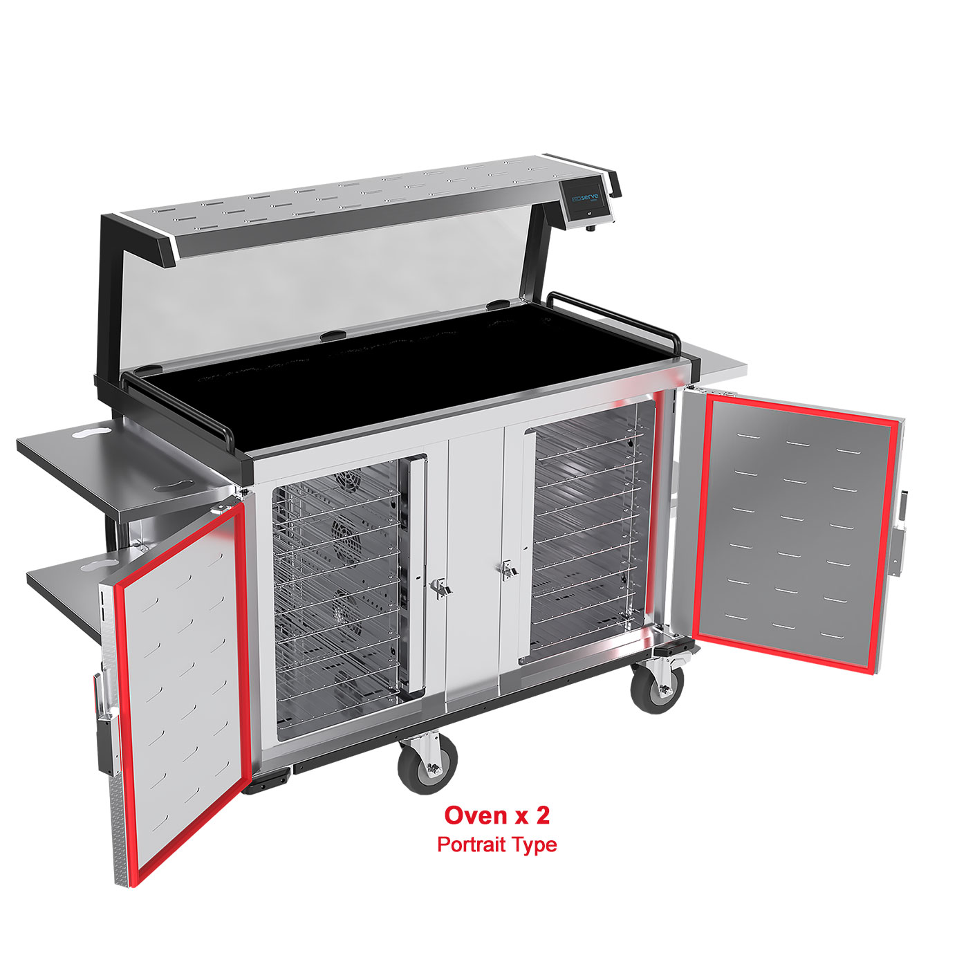 Purpose-built for cooking, regenerating, and serving fresh, chilled, or frozen bulk food, this unit gives customers the flexibility to choose their meal at the point of service. It’s ideal for multi-food portioning and distribution, featuring two completely independent ovens both have a unique multi-fan air re-circulation system allowing fast and even heat distribution throughout. Optimized for GN (Gastronorm) containers, there are eight shelf position in each oven set at 71 mm intervals . This allows up to eight GN 1/1 containers per oven.