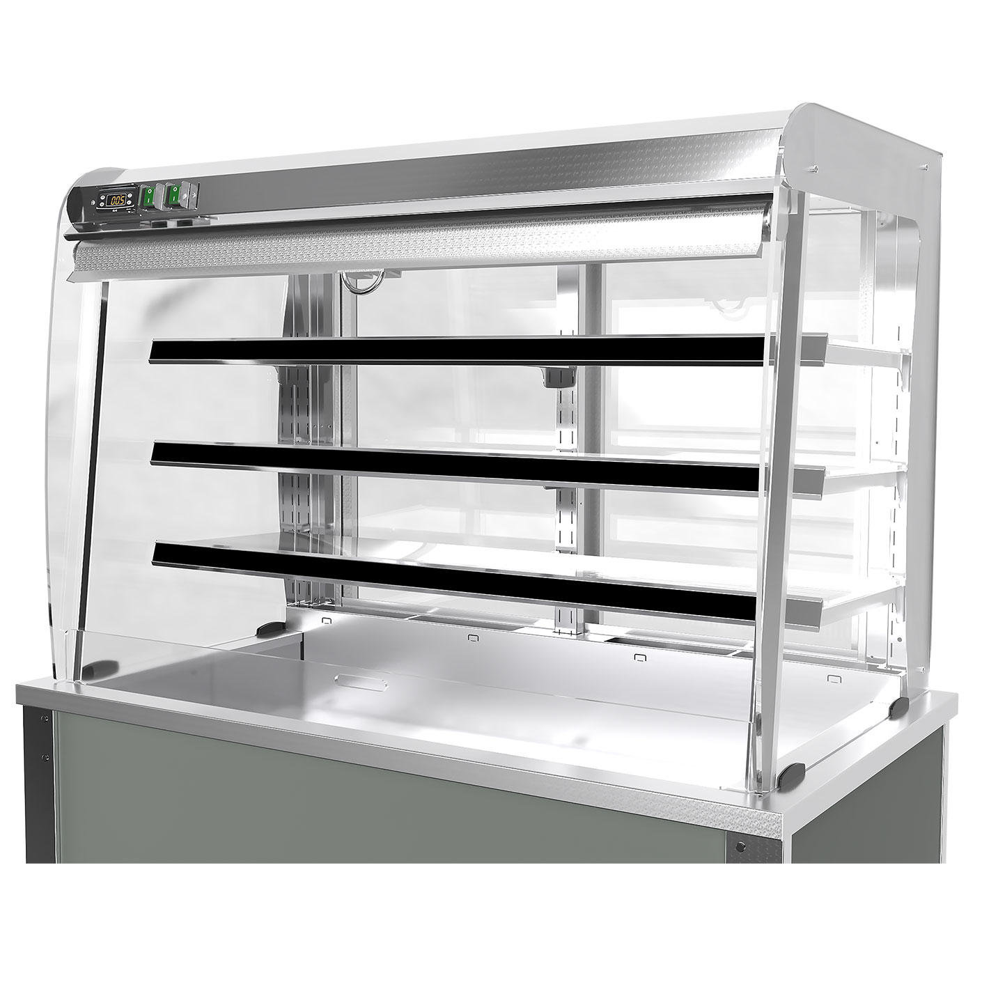 a constant recirculating cold air curtain completely enveloping the food displayed. - Holding pre-chilled food at a safe, regulated temperature while retaining taste and freshness.