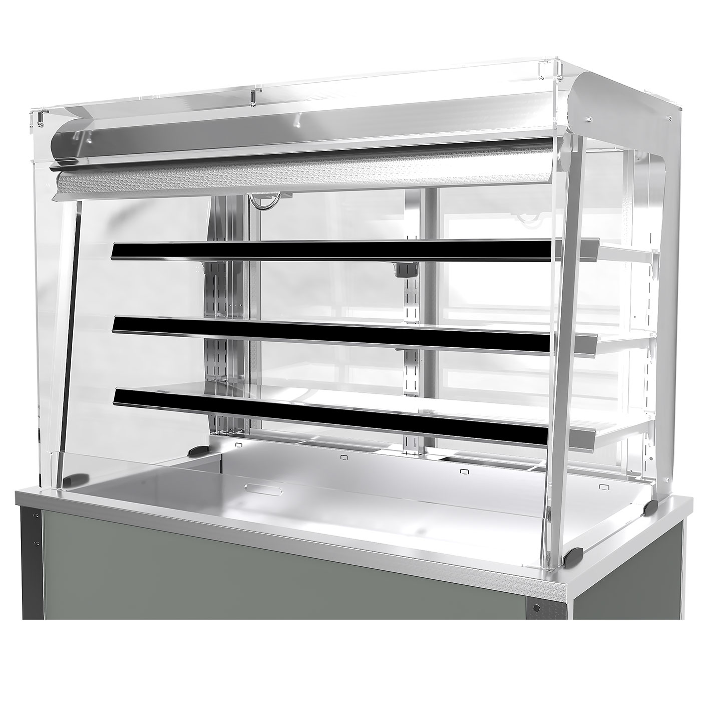 a constant recirculating cold air curtain completely enveloping the food displayed. - Holding pre-chilled food at a safe, regulated temperature while retaining taste and freshness.