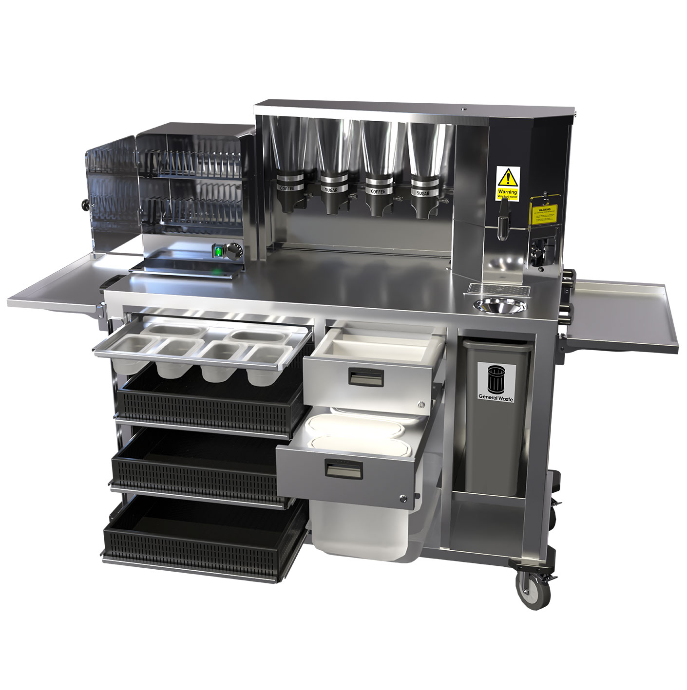 Specially designed for breakfast, tea & coffee service. An attractive, easy to manoeuvre and compact trolley service with space for everything required. Perfect for aged care facilities and hospitals. The mobile ward service trolley allows beverages, refreshments, and light meals to be served to patients and visitors at the bed side or in lounges and other communal areas. Great for use in busy hospitals retirement homes and various other types of healthcare facilities. Push pull handles at each end and the simple layout facilitates easy positioning and set up. Very easy to use and keep clean,a practical hygienic and versatile design with a wide range of options and features, multiple drawers and runners, for holding baskets pans and ingredient containers etc. Crockery cutlery and condiments carried on board.