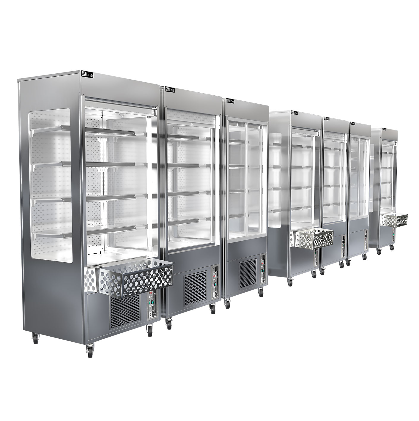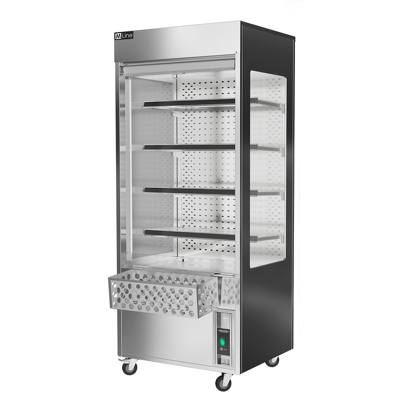 Designed to compliment the chilled M-Line merchandisers with panoramic side glass, internal glass shelving and LED illumination for enhanced food display and all round viability. These sharp styled units are a perfect fit for any modern designed retail grab and go food outlet, ideal for delicatessens, restaurants, universities, schools, hospitals, supermarkets and coffee shops. The hygienic free-standing mobile design made inside and out from bright polished stainless steel provides easy access for pre packed snacks and cool drinks. Incorporating a low height base display and 4 glass display shelves. Perfect for confectionery, crisp snacks, and fruit etc.