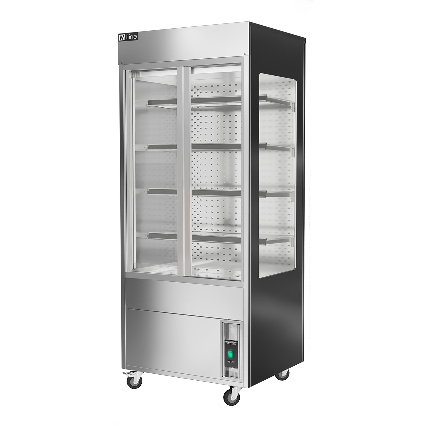 Designed to compliment the chilled M-Line merchandisers with panoramic side glass, internal glass shelving and LED illumination for enhanced food display and all round viability. These sharp styled units are a perfect fit for any modern designed retail grab and go food outlet, ideal for delicatessens, restaurants, universities, schools, hospitals, supermarkets and coffee shops. The hygienic free-standing mobile design made inside and out from bright polished stainless steel provides easy access for pre packed snacks and cool drinks. Incorporating a low height base display and 4 glass display shelves. Perfect for confectionery, crisp snacks, and fruit etc.