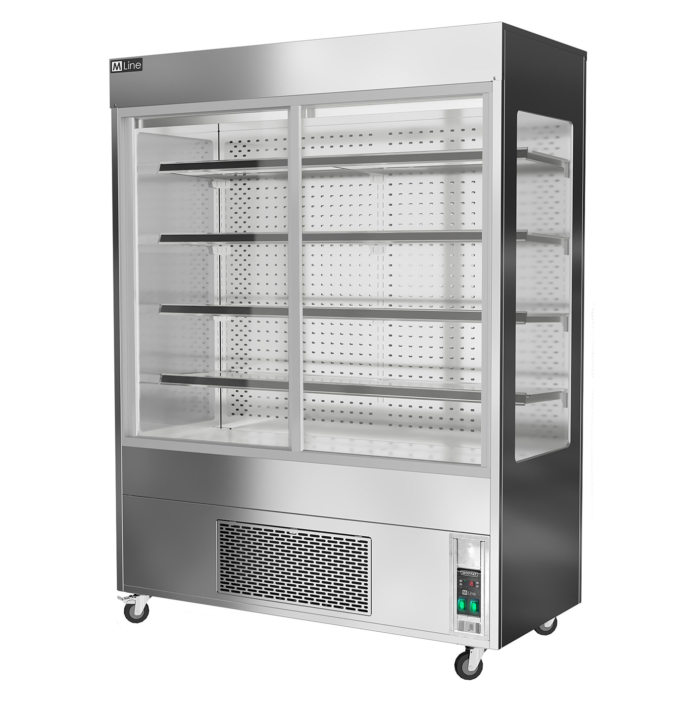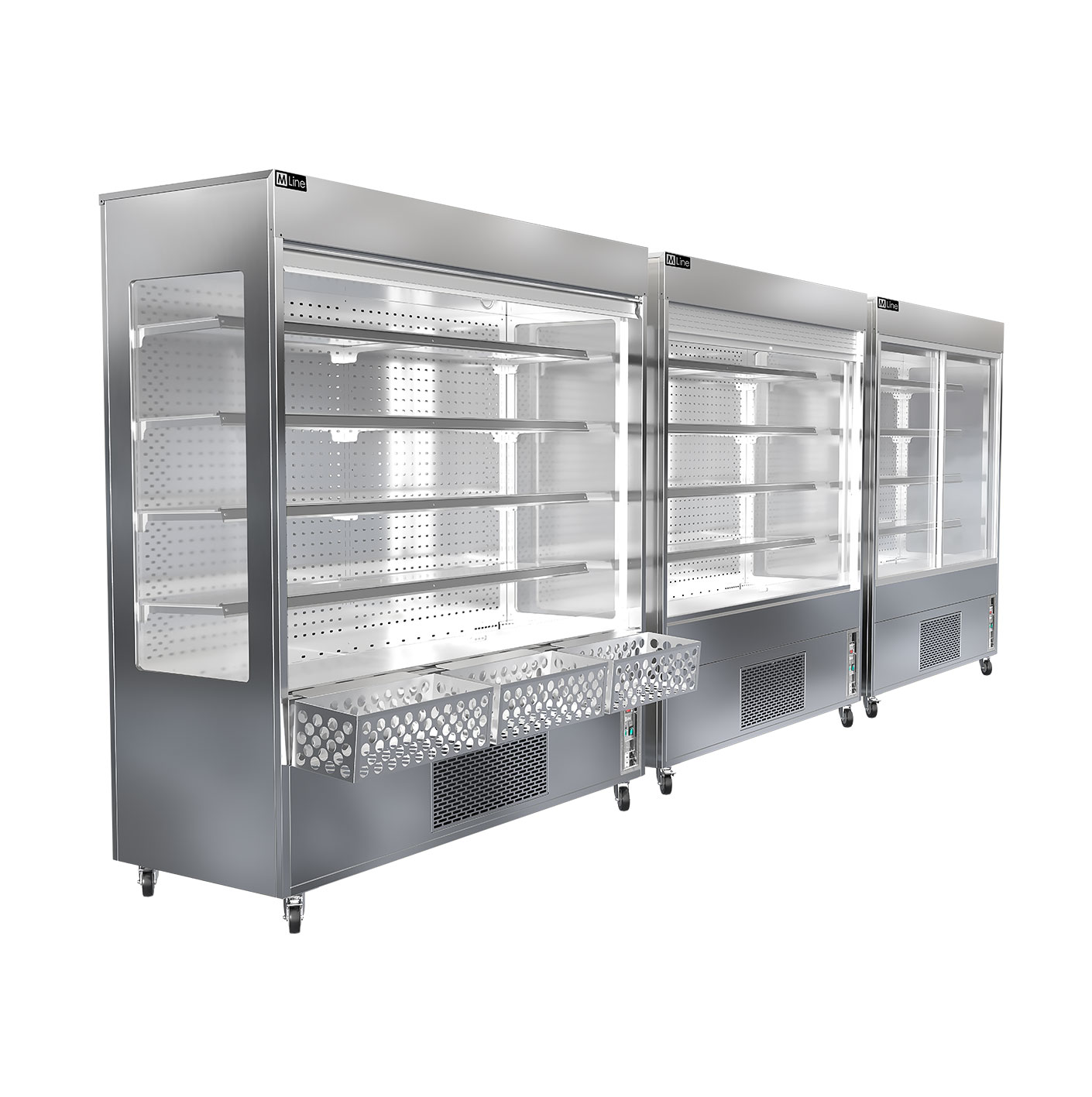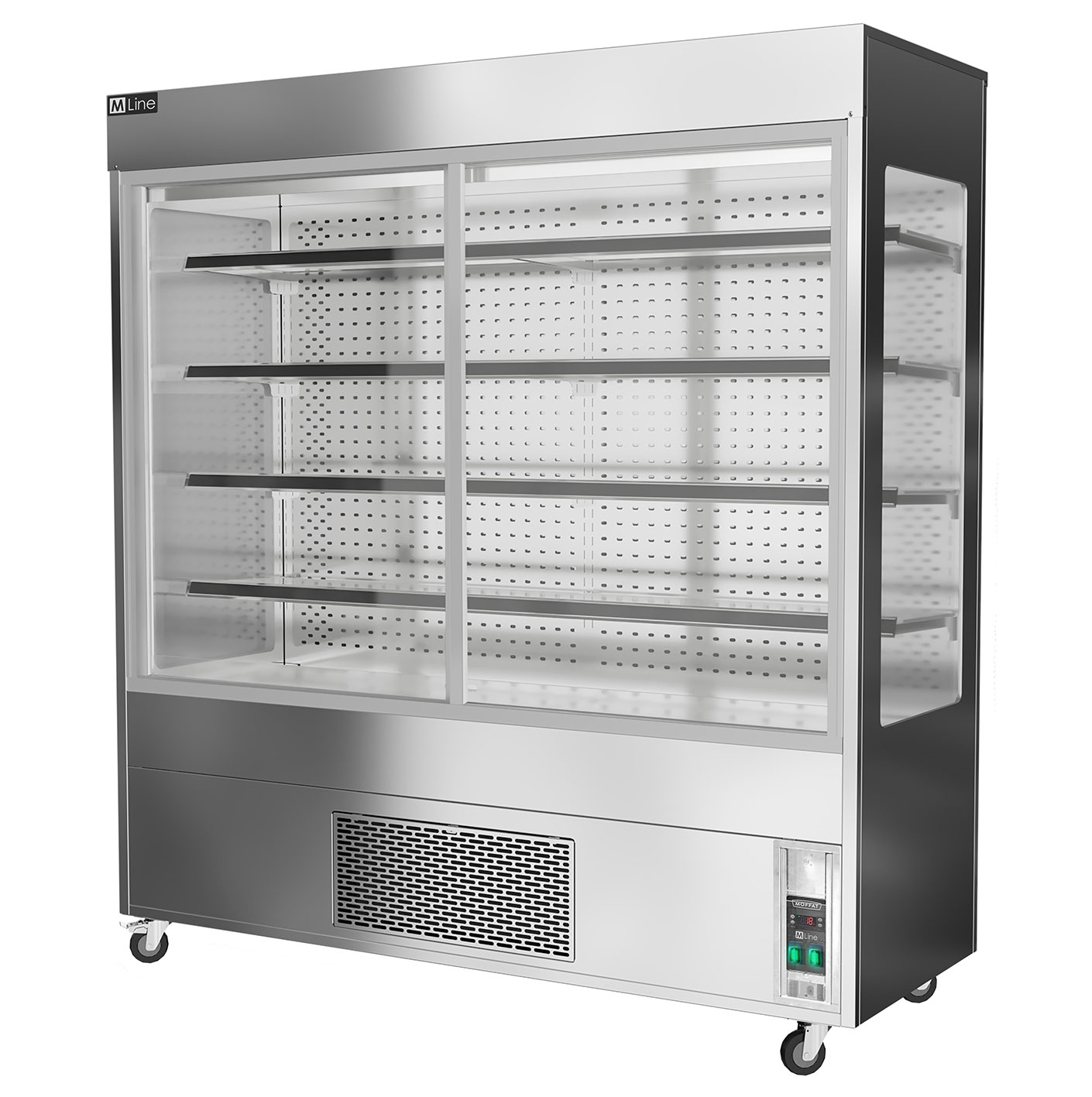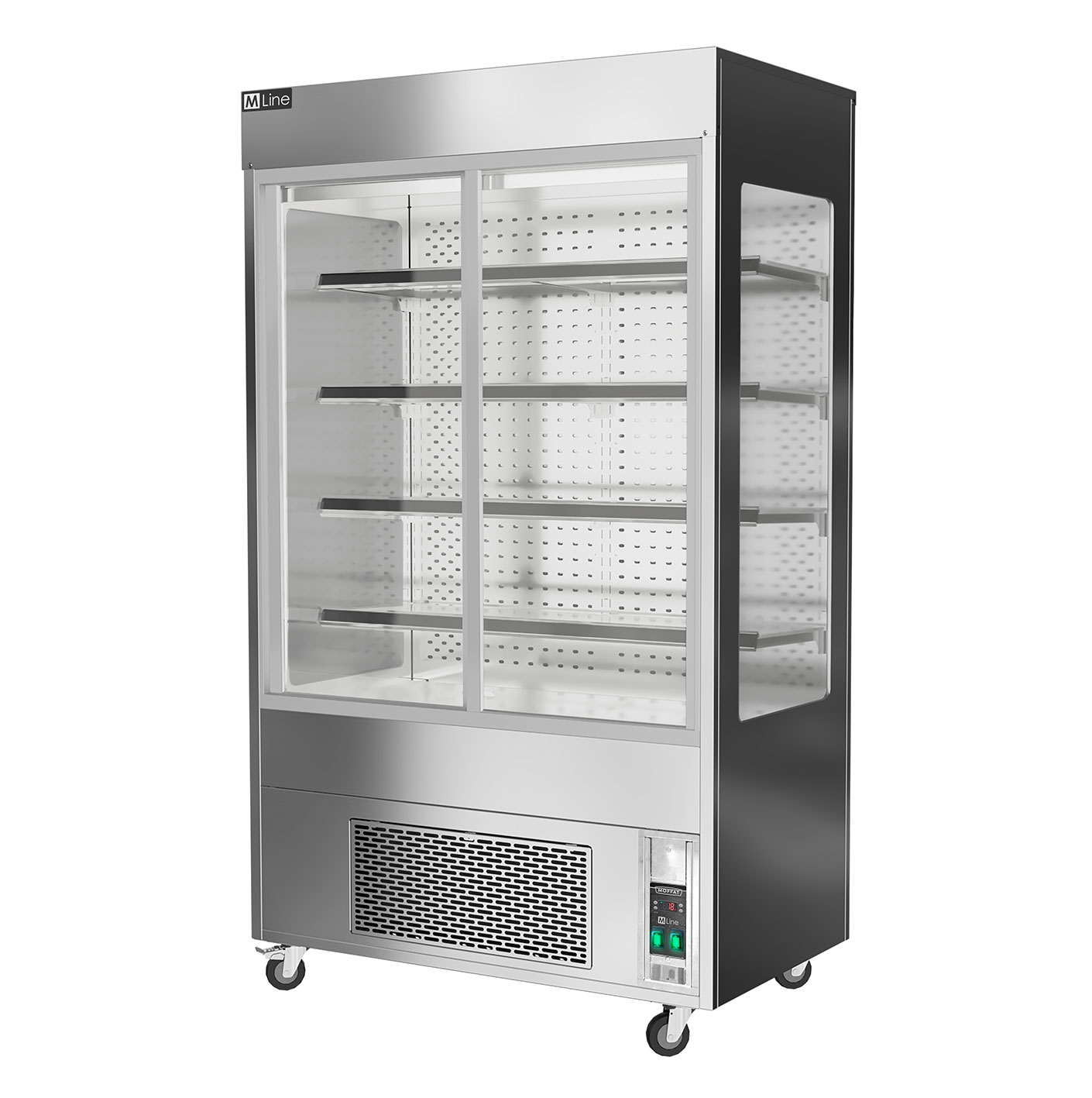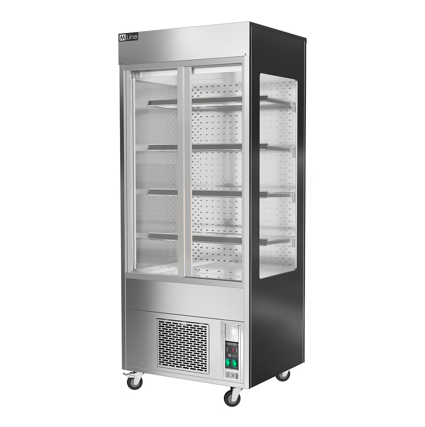 M-Line merchandisers with panoramic side glass, internal glass shelving and LED illumination for enhanced food display and all round viability. These sharp styled units are a perfect fit for any modern designed retail grab and go food outlet, ideal for delicatessens, restaurants, universities, schools, hospitals, supermarkets and coffee shops. The hygienic free-standing mobile design made inside and out from bright polished stainless steel provides easy access for pre packed snacks and cool drinks. Incorporating a low height cold well and 4 glass display shelves.