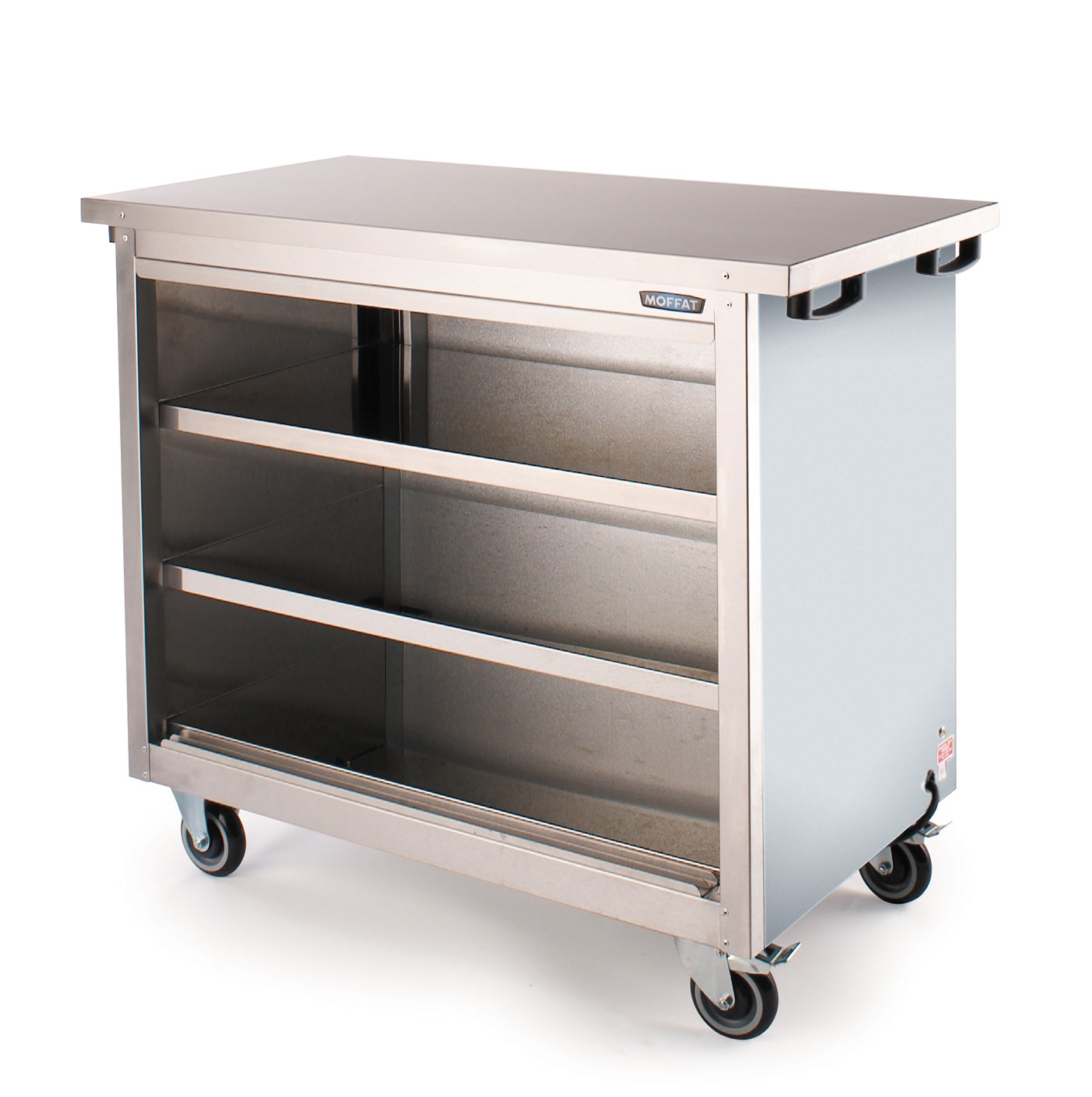A truly economical way of serving food. There are no expensive installation costs. Simply butt them together to form a continuous top and apply the brakes. Simply set up in any area available for use during meal times and speedily remove after service when the area reverts to its normal function.