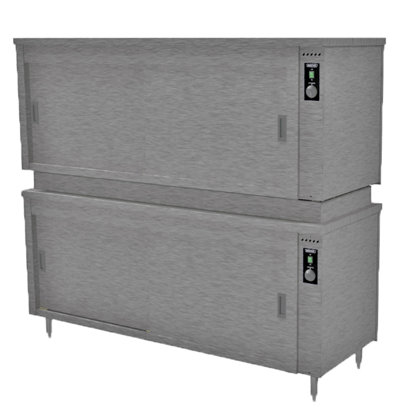Double stacked static hot-cupboards with sliding doors. Based on Gastronorm GN1/1pans available in four lengths. Compact high capacity units, hot food or plates and dishes can be held warm ready for service. Fully insulated robust stainless-steel construction with a solid plain top. A heavy-duty range aimed at the busy kitchen particularly suited to Restaurants, Hotels, Conference Centres, Universities, Schools, and Holiday Centres. Excellent for pre-heating plates and dishes, as well as the temporary storage of precooked food e.g. cooked meats, poultry, vegetables, sauces, etc. With an energy saving, fast heat up and recovery forced air heating and recirculation system, spreading the heat evenly throughout the cupboard.