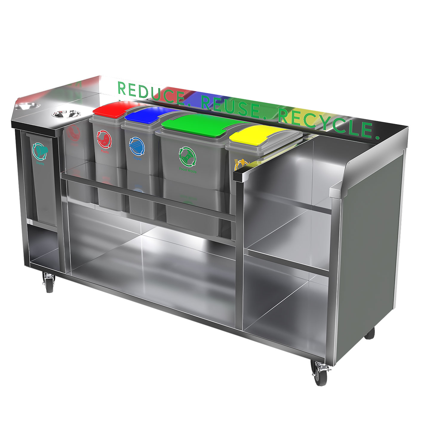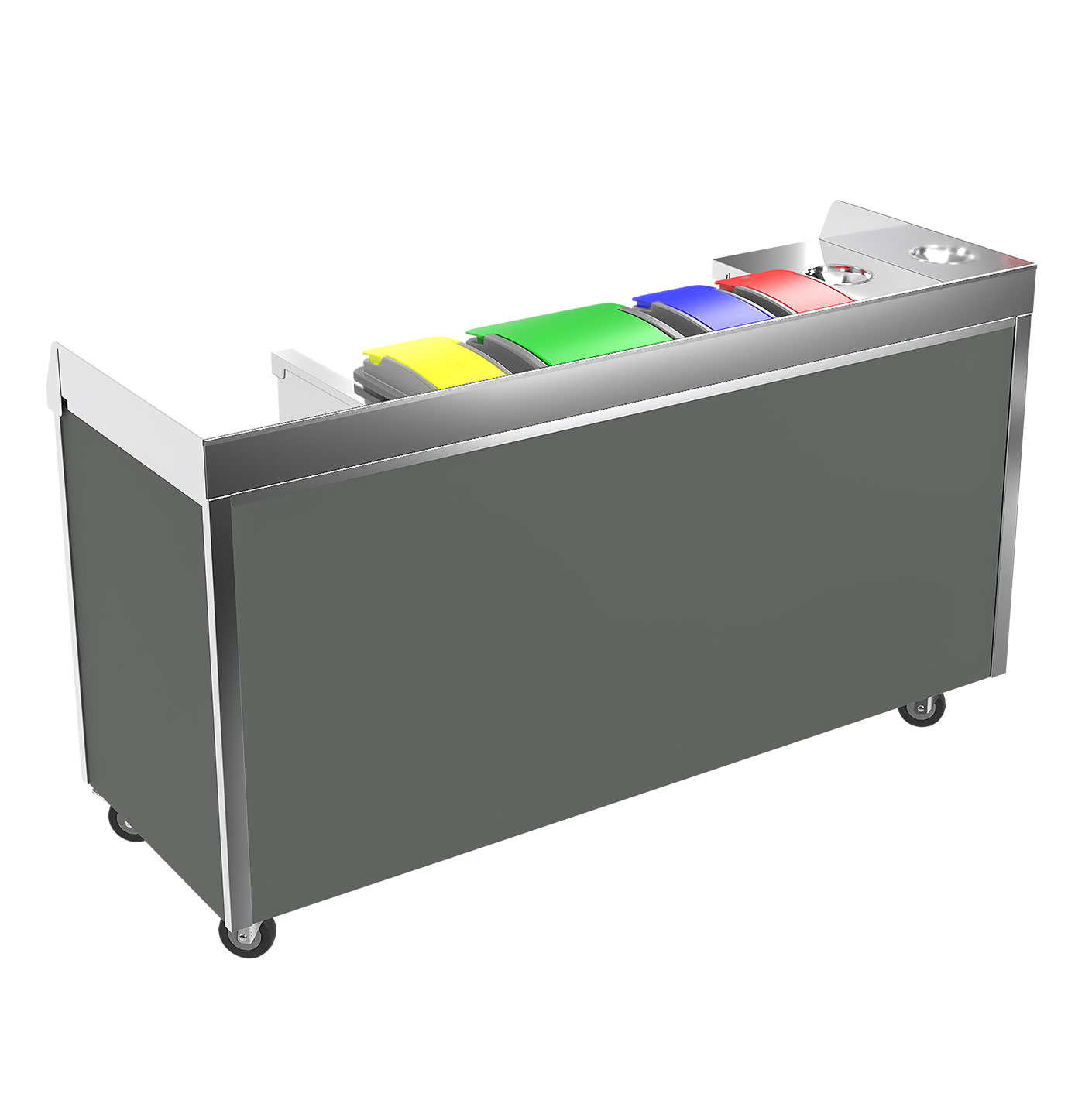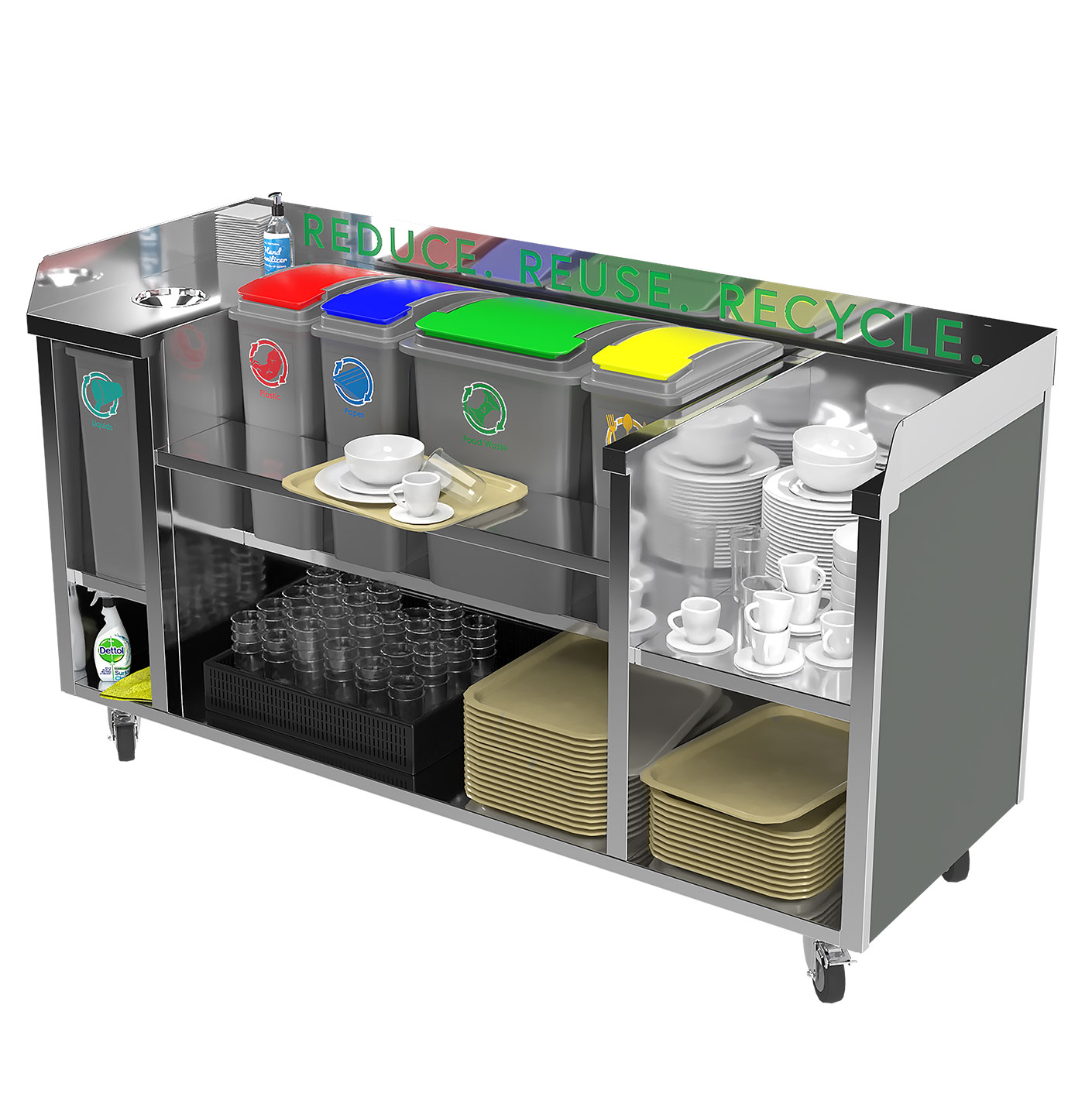 Model designed for waste management, complete with multiple recycling bins and tray & plate return storage.