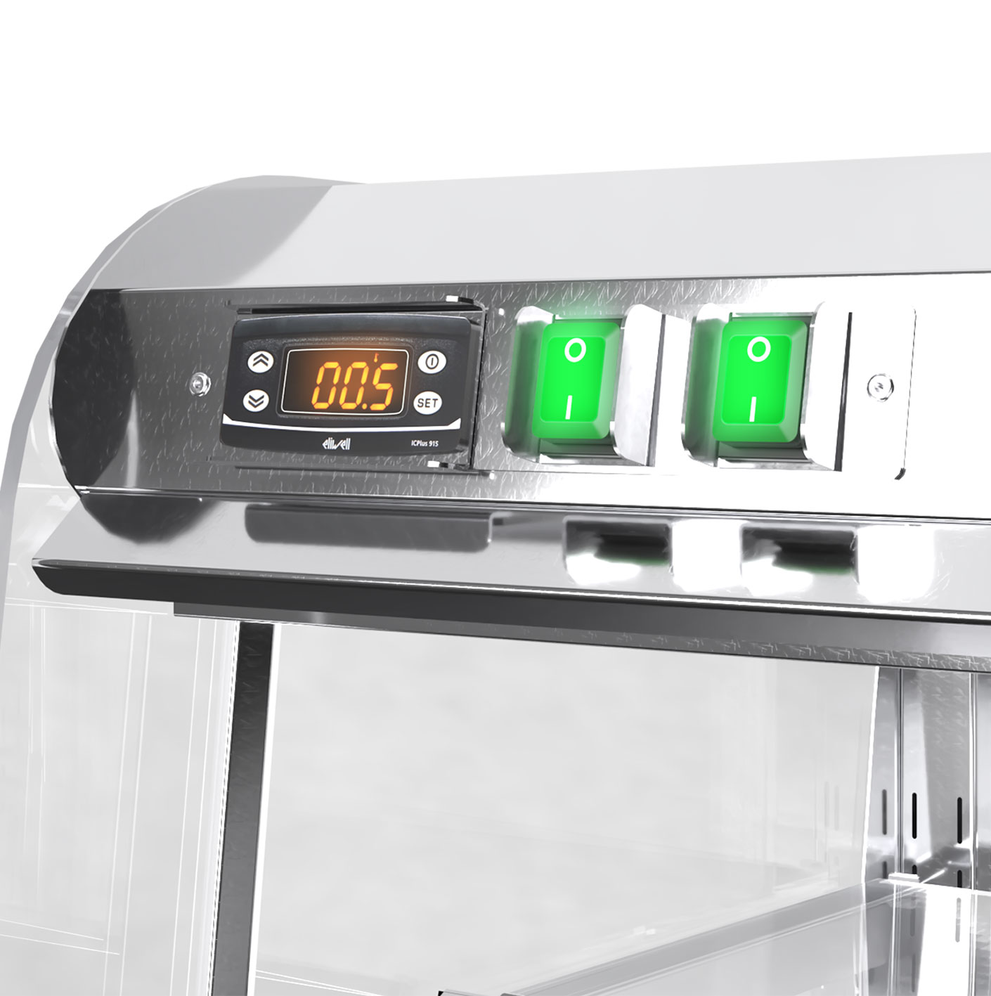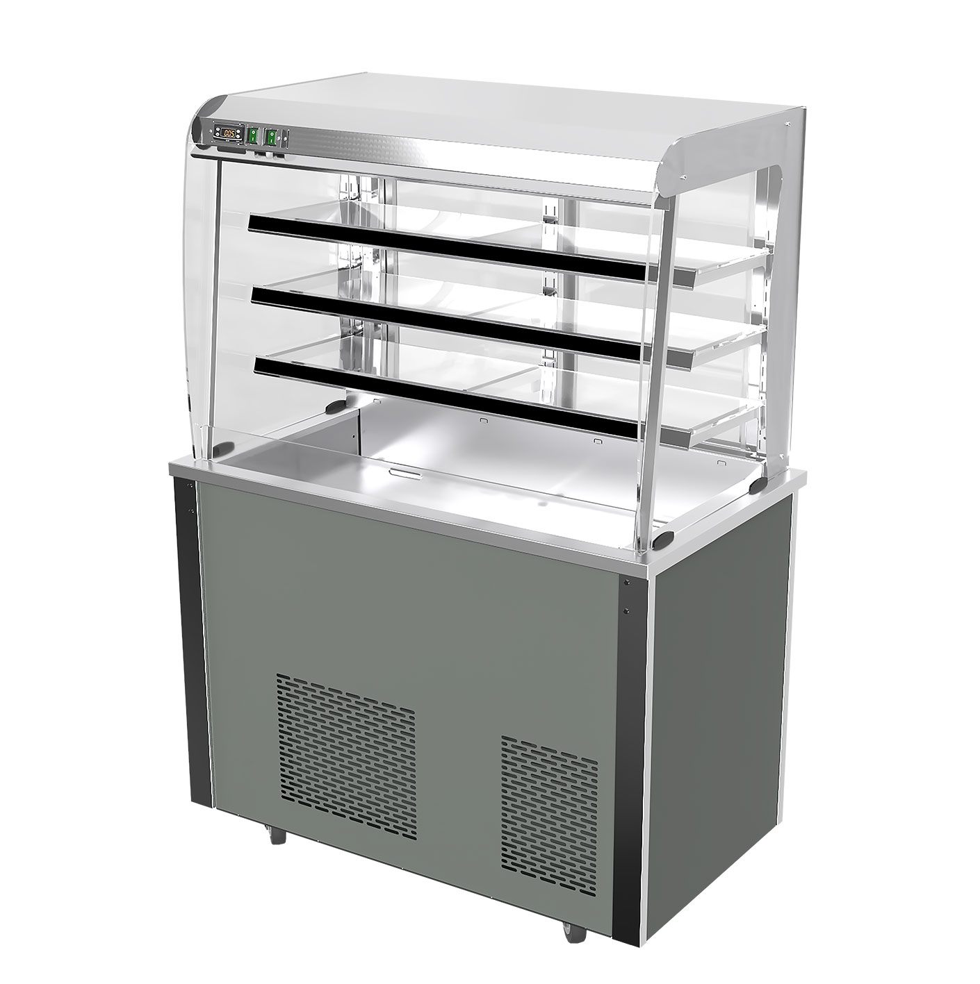 a constant recirculating cold air curtain completely enveloping the food displayed. - Holding pre-chilled food at a safe, regulated temperature while retaining taste and freshness.