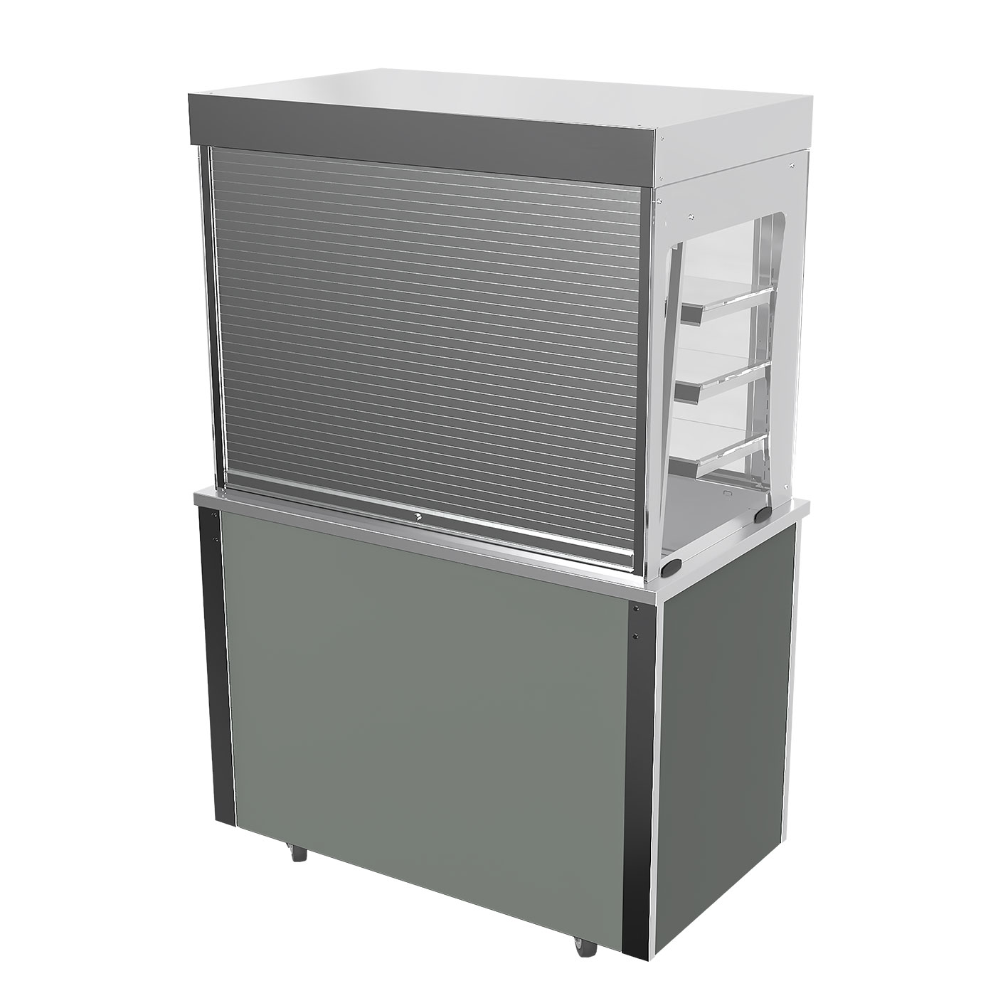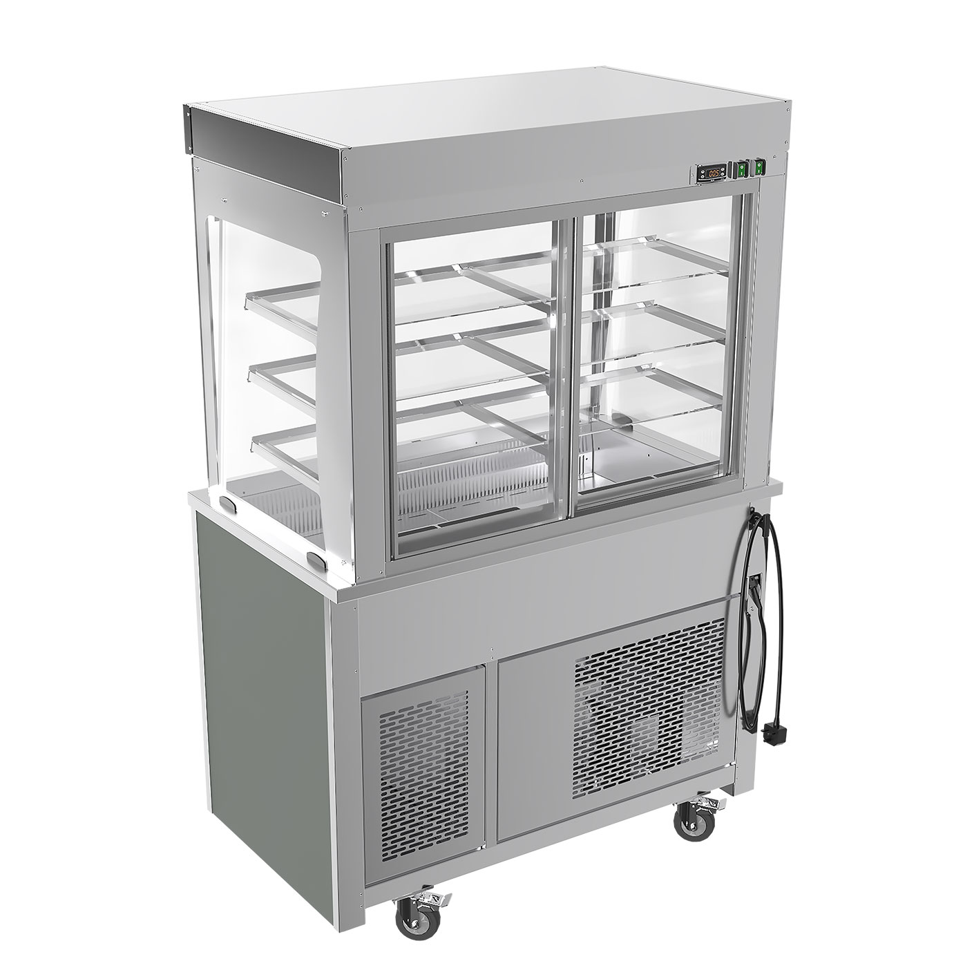a constant recirculating cold air curtain completely enveloping the food displayed. - Holding pre-chilled food at a safe, regulated temperature while retaining taste and freshness.