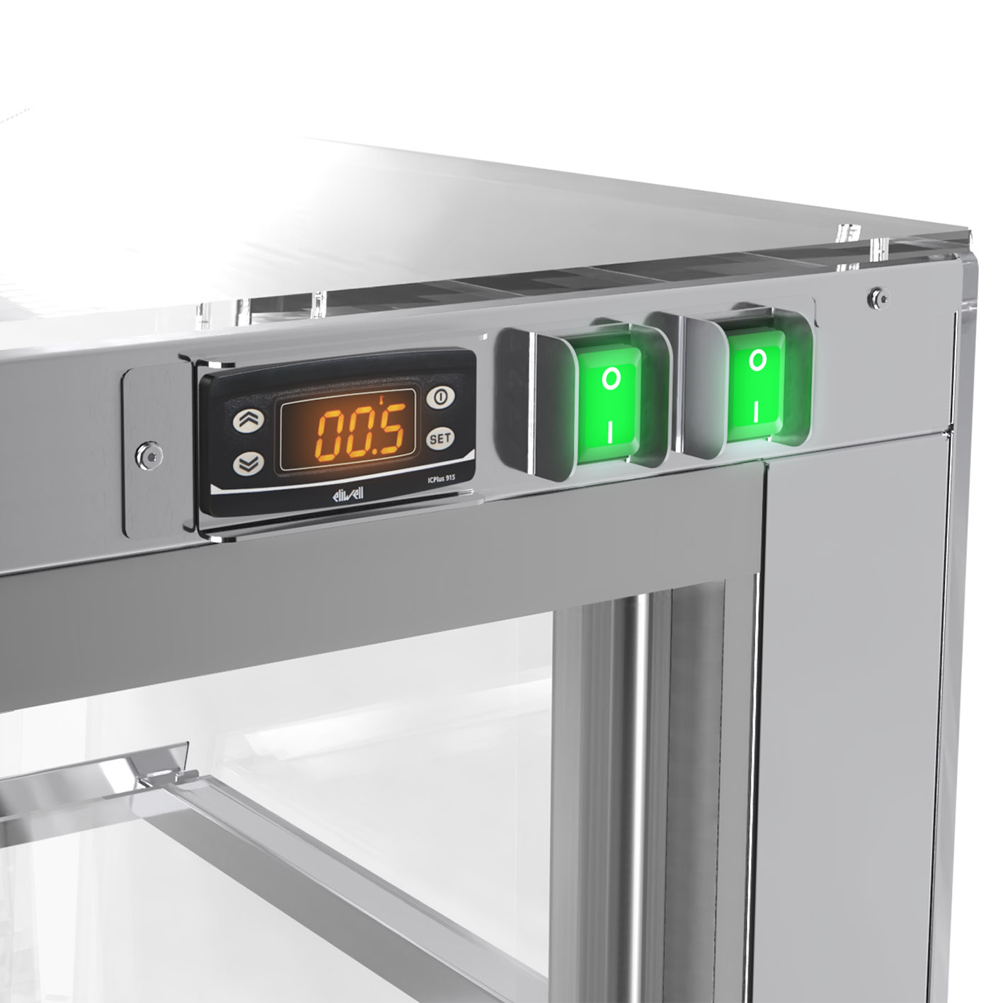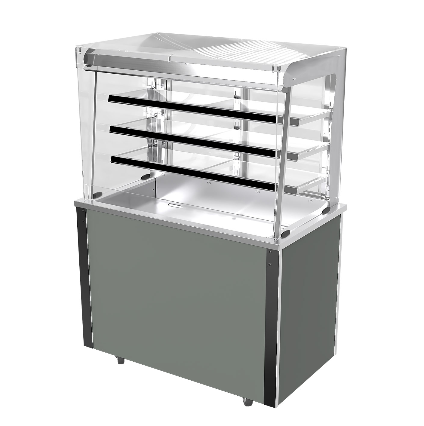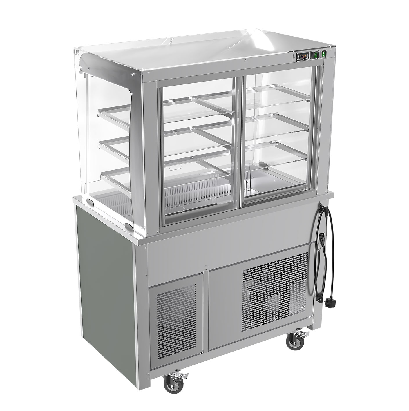 a constant recirculating cold air curtain completely enveloping the food displayed. - Holding pre-chilled food at a safe, regulated temperature while retaining taste and freshness.