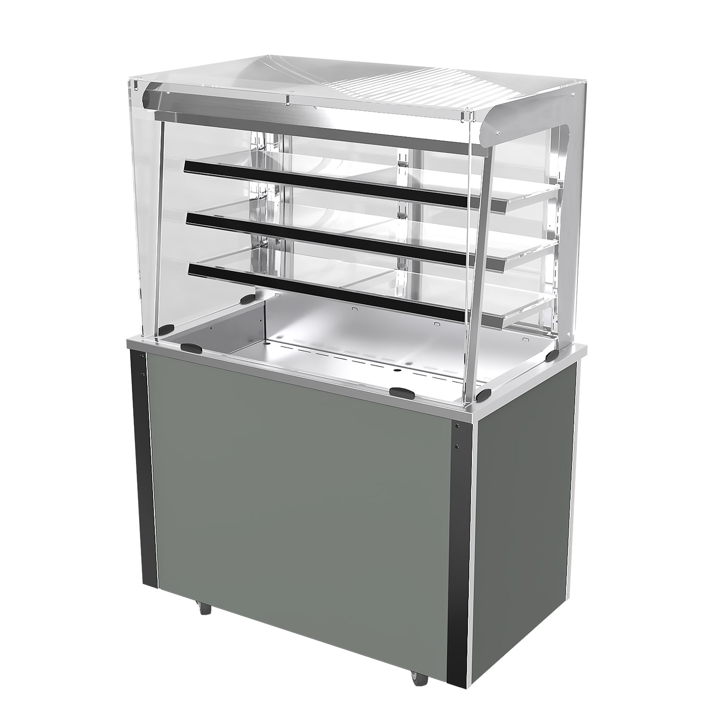 Chilled display units incorporating a cold well and 3 glass display shelves. The unique Moffat innovative “Polar Air Stream” system provides a constant recirculating cold air curtain completely enveloping the food displayed. Holding pre-chilled food at a safe, regulated temperature while retaining taste and freshness. Perfect for sandwiches, fruit, yogurts and cold drinks. Self-contained units with accurate, digital control, automatic defrost, high pressure warning and automatic condensate evaporation. Utilising a highly efficient, naturally occurring, hermetically sealed, hydrocarbon gas type R290 reducing carbon footprint and energy consumption.
