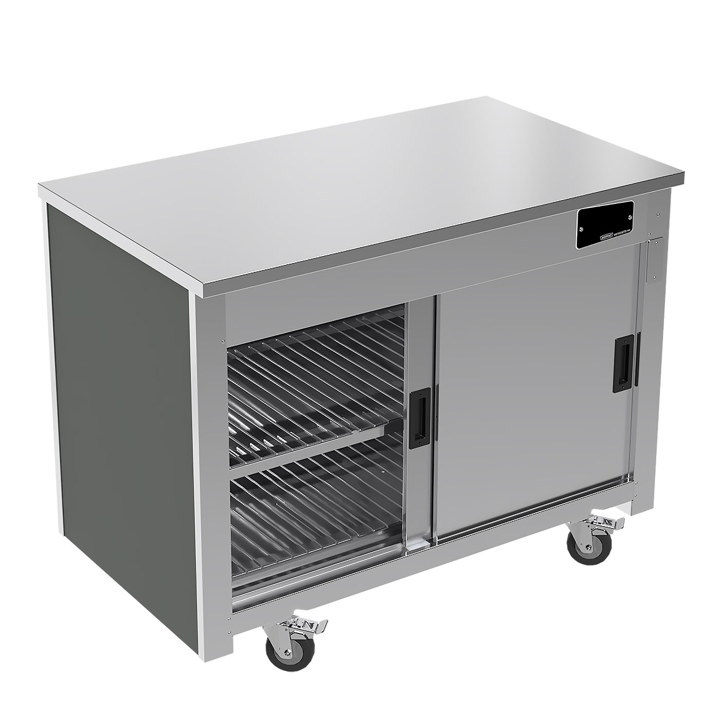 Mobile Storage cupboards with sliding doors. Based on gastronorm GN1/1 pans available in four lengths. Compact high capacity units. A robust stainless-steel construction with a solid plain top. Excellent storage for plates and dishes.